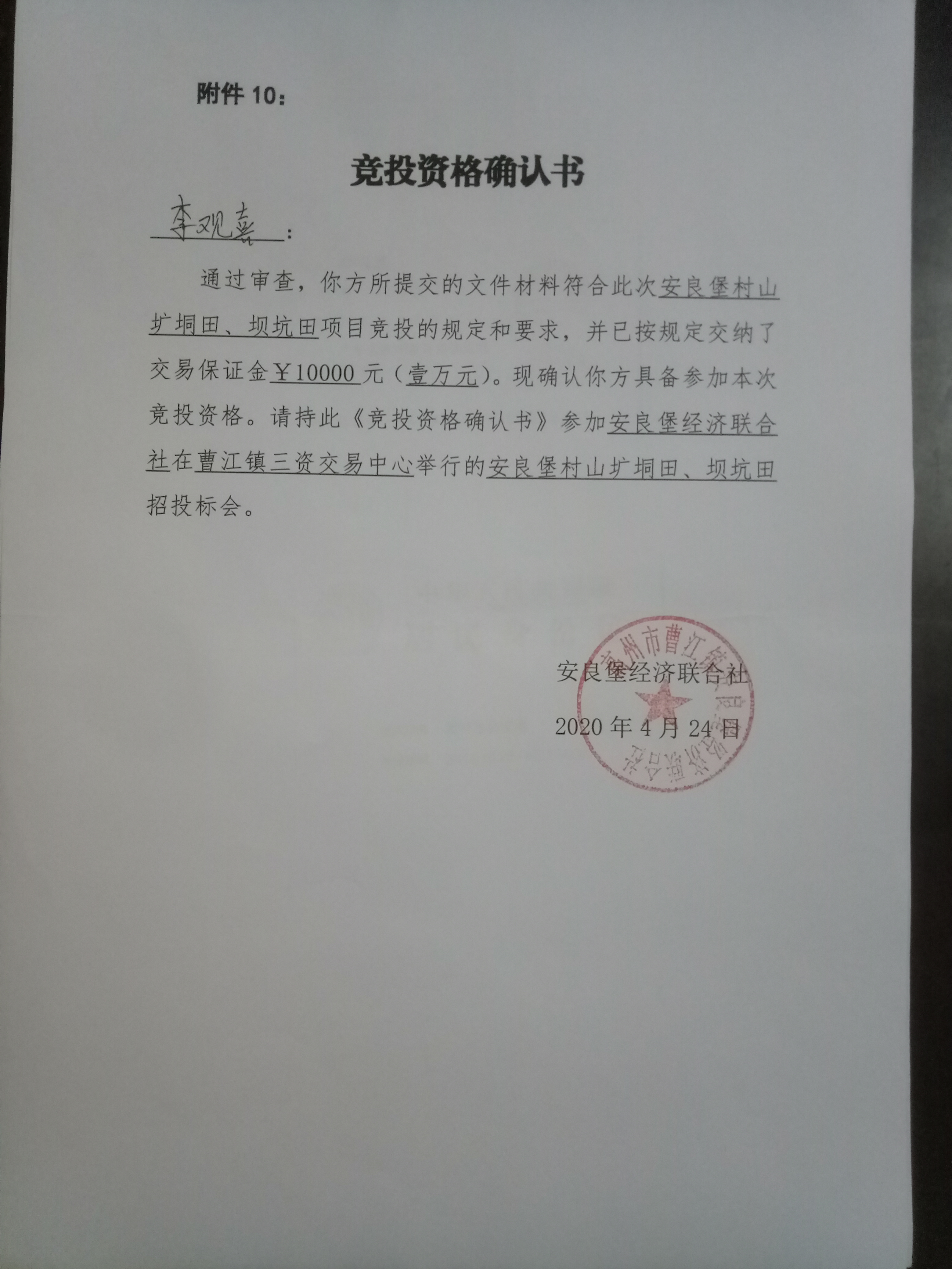 • 处置说明:安良堡村经济联合社社员代表于2020年 4 月 9 日在安良堡村委会召开社员代表会议,对安良堡村山圹垌田招标的《农村集体资产交易方案》(编号:〔2020 〕第 2 号 )、进行民主表决。会议由程德兴主持,职务:书记、主任。应到会成员或代表数 54 人,实际到会成员或代表数41人,占应到会成员或代表数76%,人数符合法律规定,本次大会召开合法有效。